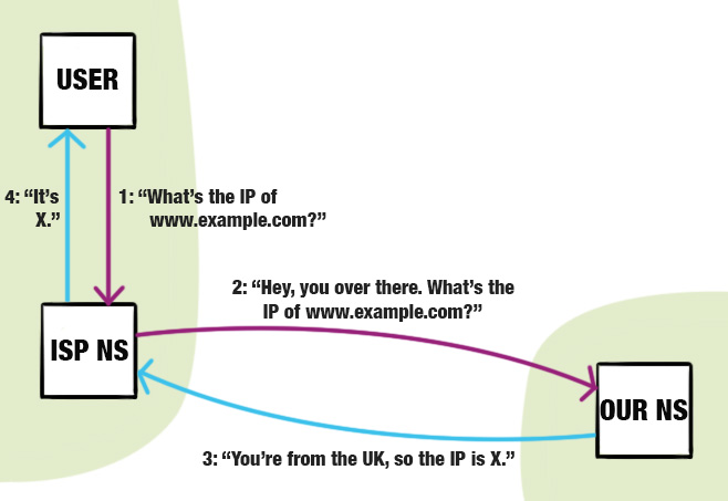 Their browser sends the DNS request to perform this resolution to the nameserver that the user is configured with — often the ISP's DNS server — and assuming the result of the query isn't in the nameserver's cache, the request may bounce through a few other nameservers until it finally reaches our custom-configured nameserver, which returns the IP of the geographically closest server to the requesting entity's IP address. Simple!
